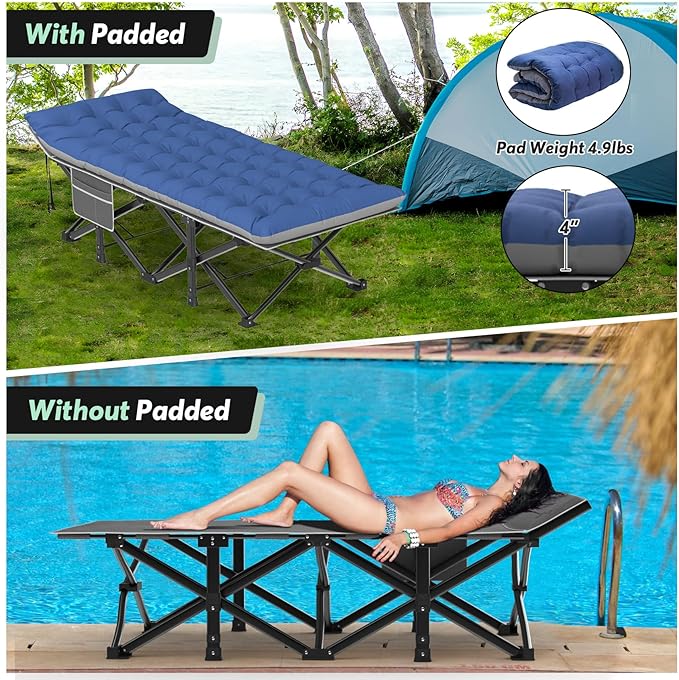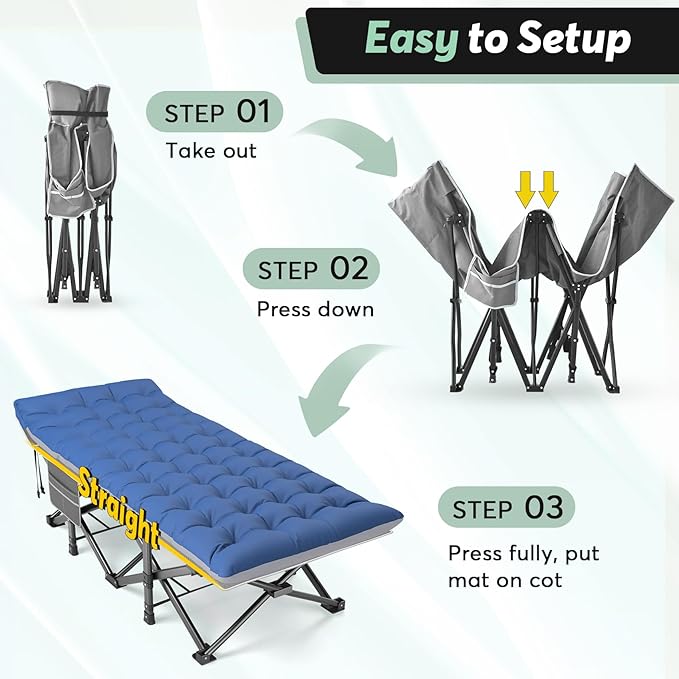 • Versatile Usage--Sleeping cot are not limited to outdoor use only. it can also be used as spare beds for guests at home or for lounging in the backyard. Their versatility makes them a practical and multi-functional piece of equipment for both camping enthusiasts and occasional users alike.