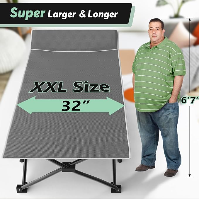 Slendor XXL Camping Cot for Adults, 79"x32"x19" Oversized Folding Cot with Mattress, Heavy Duty 500lbs Support, Portable Carry Bag for Travel, Guest & Outdoor Use