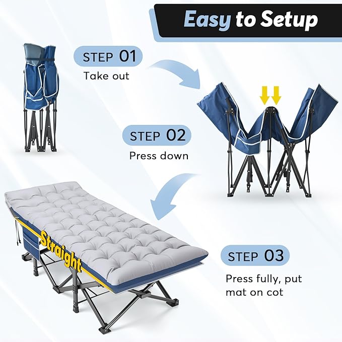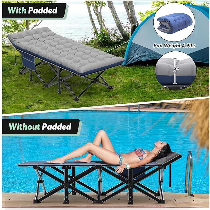 Slendor Oversized XXL Camping Cot, Folding Cot for Adults, 79" L x 32" W x 19" H Sleeping Cot with Mattress, Carry Bag, Camp Cot Bed for Travel, Guest, Support 500lbs, Blue Cot+ Grey Pad