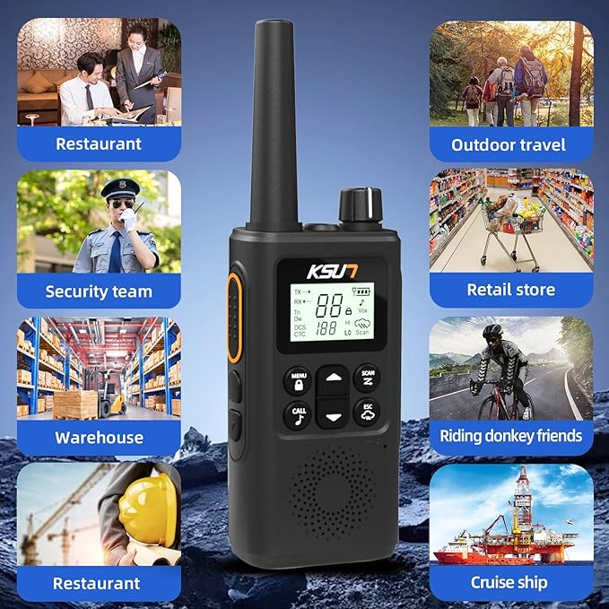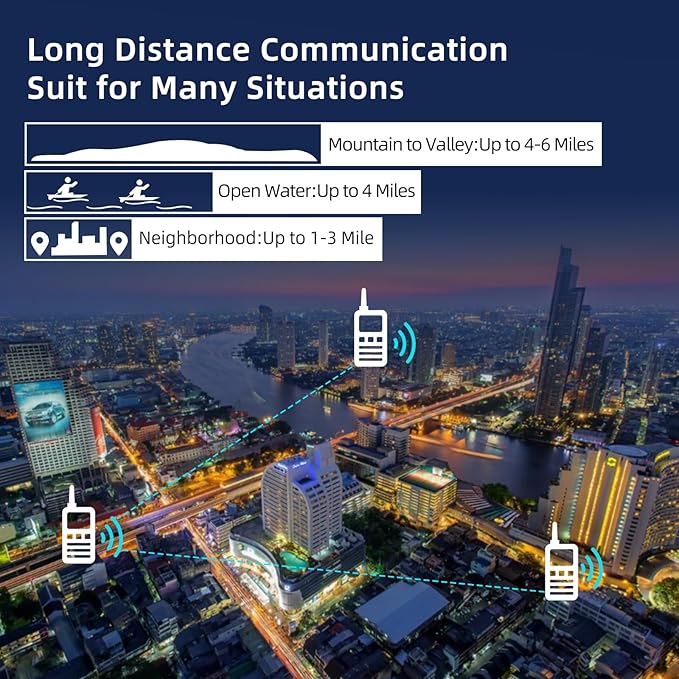 • [Long-Range communication]: walkie talkies long range can reach 6 miles in open areas such as rural areas, suburbs or seaside, etc. where there is no shelter. If in cities or towns, walkie talkies can reach 3-4miles in most cases. The actual distance Depends on the obstruction of the current environment.