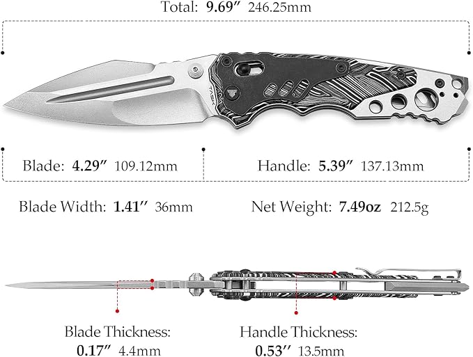 • Parameters: Overall length:9.69"(246.25mm) , Blade length:4.29"(109.12mm), Closed length: 5.39"(137.13mm), Blade thickness: 0.17"(4.4mm), Shank thickness: 0.53"(13.5mm), Hardness: 58-60HRC, Weight: 7.49oz(212.5g), Blade Material:Sandvik 14C28N, Blade surface: black PVD coating & stonewash, Designer: Tasknives