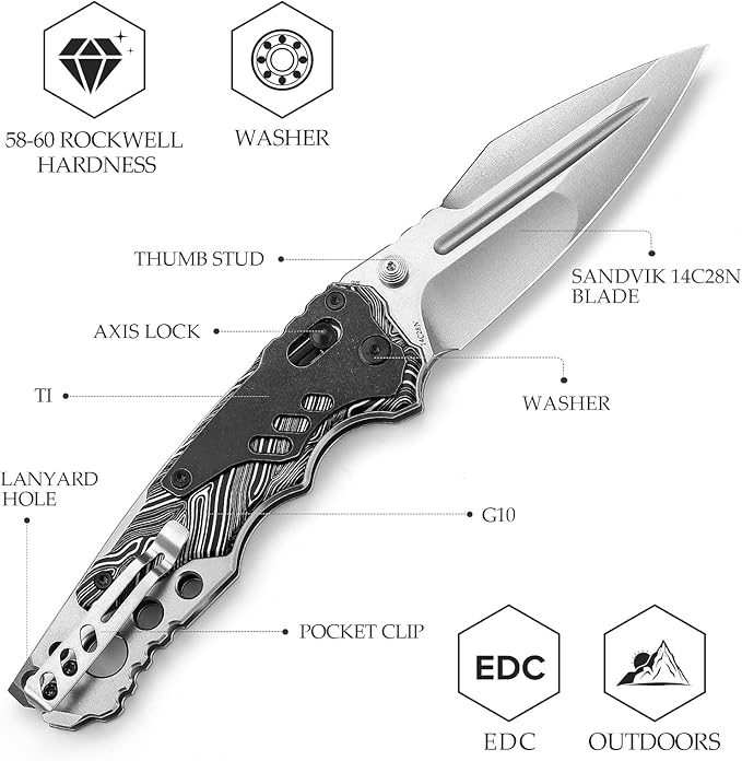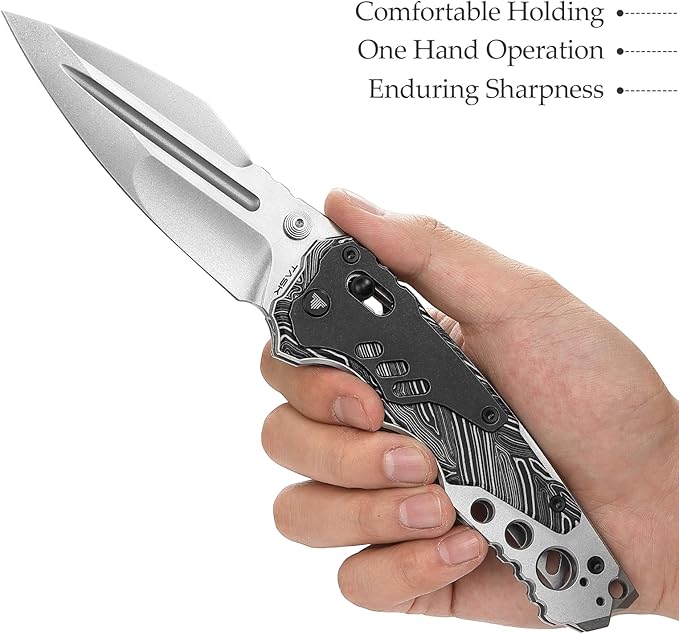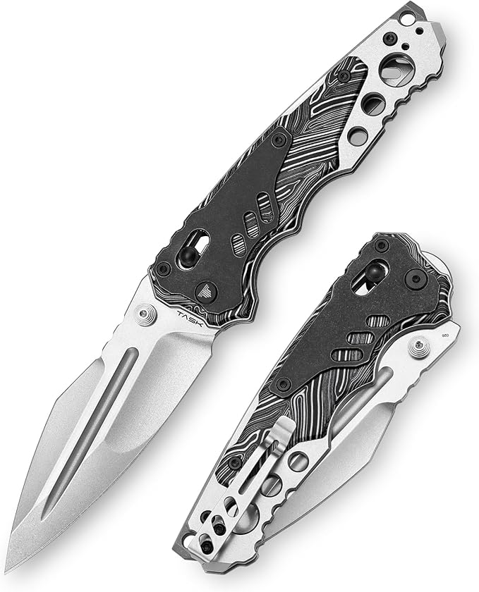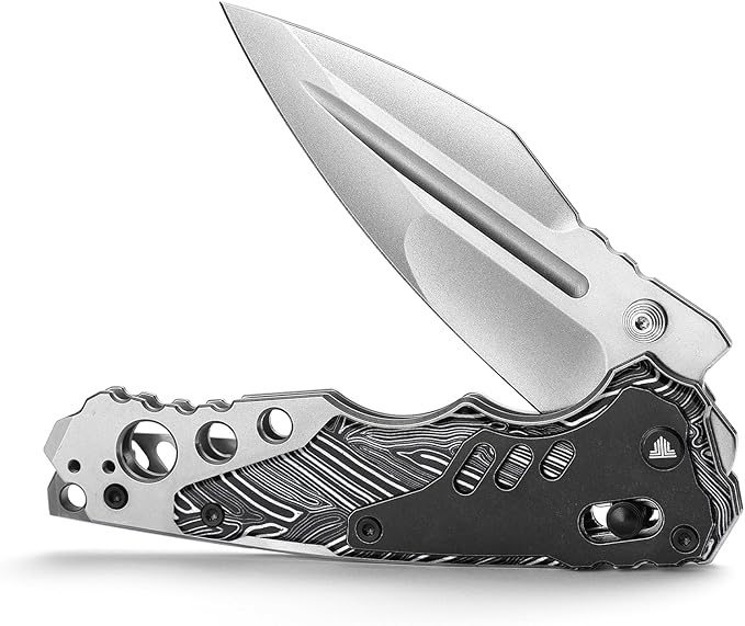 '-Intruder-03BW|Heavy Folding Pocket Knife for Men,Outdoor Camping EDC Knives with Clip ,4.29" Stonewash 14C28N Steel Blade ,Brass Washer,Ti & Damascus G10 Handle