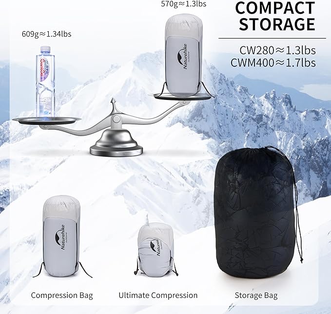 • ULTRALIGHT BACKPACKING SLEEPING BAG - CWM400 weighs only 1.74 lbs/790g, which is about the same weight as a bottle of water. Stowed size: Φ6.3"*13.7 "L/16*35cm, you can even remove the sleeping bag organizer from the backpack with one hand. The lightweight and compact design allows you to take the sleeping bag anywhere you want to go and lie down in the grassland/mountain/desert to see the beautiful starry sky