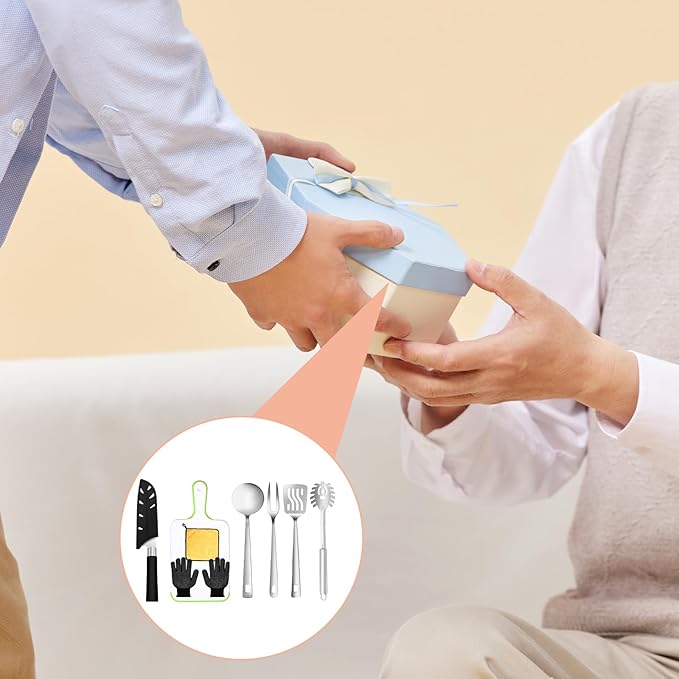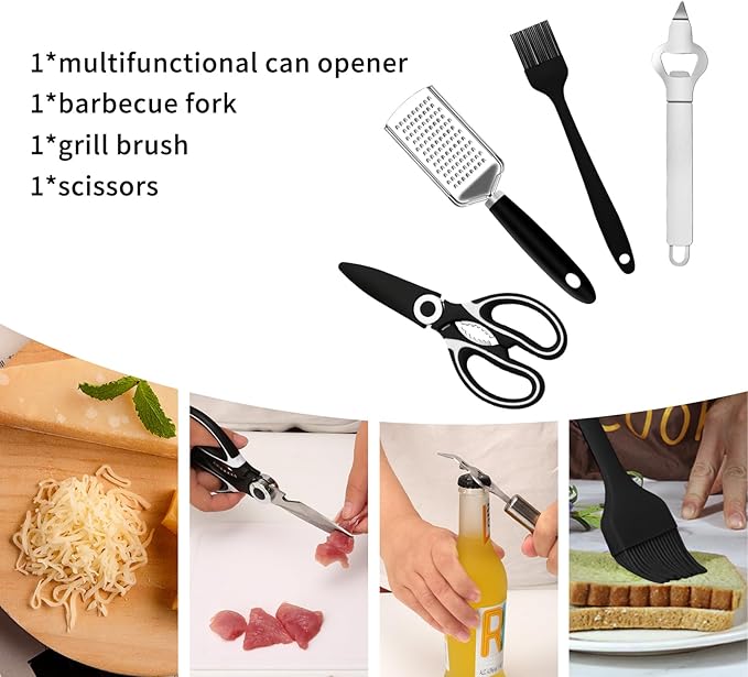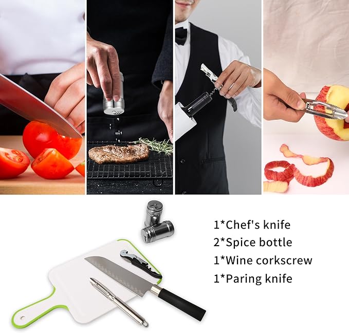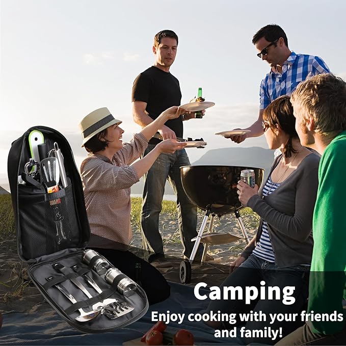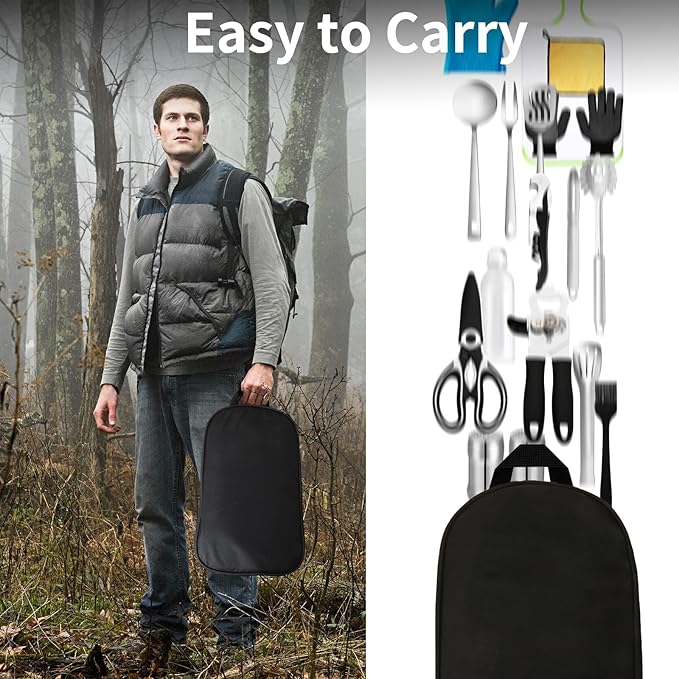 • Camping Cooking Utensils Set:Camping accessories include chopping board*1, spatula*1, soup ladle*1, bread clip*1, scissors*1, wine corkscrew*1, chef's knife*1, barbecue fork*1, spice bottle*2, paring knife*1, apron*1, towel*1, non-slip gloves*1 and storage bag*1. This is a complete set of camping utensils to meet all your needs.