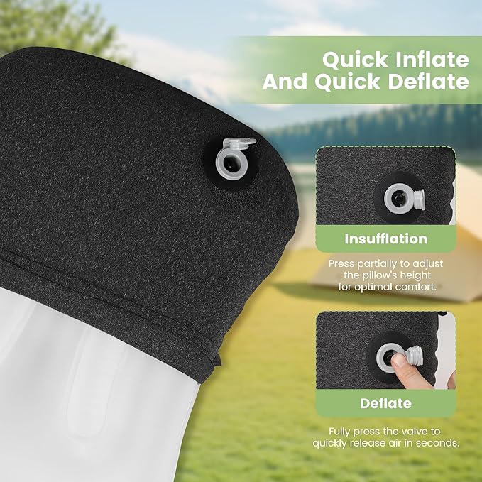 • Easy Inflation Valve - The unique one-button valve design makes inflation incredibly simple. With just 5-8 breaths, the pillow is fully inflated without the need to press a button. To deflate, just press the button, and the pillow releases air in seconds. Adjust the pillow's height and softness to your preference, providing home-like comfort even in the great outdoors