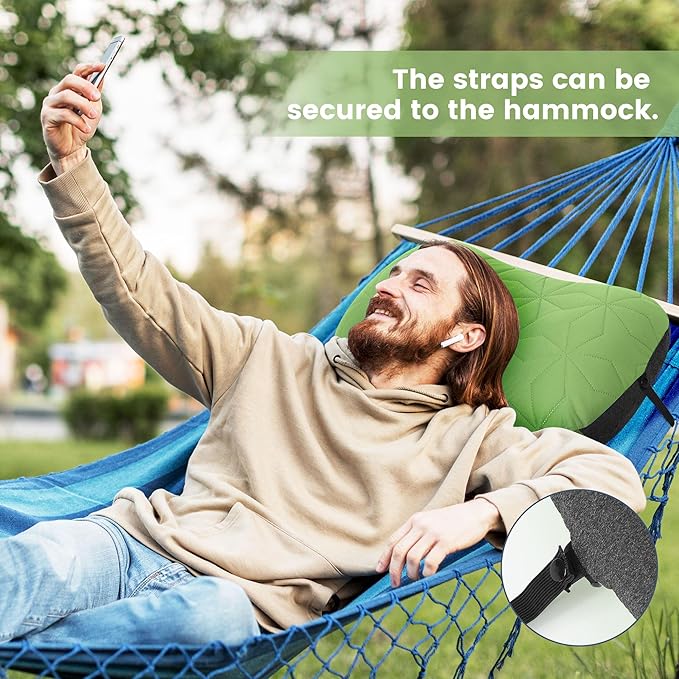• Ergonomic Design - Whether you're a back sleeper or side sleeper, this inflatable camping pillow provides superior neck support with its optimized height and ergonomic design. The blow up pillow contours perfectly to your neck curve, ensuring a restful night's sleep. The strap design pairs perfectly with air mattresses or cots, preventing the pillow from shifting during the night. It also doubles as an inflatable lumbar pillow, providing relief from back discomfort caused by prolonged travel or work