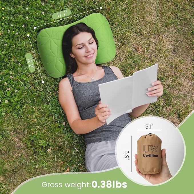 • Compact and Portable - Designed for adventurers on the go, this inflatable camping pillow folds down to just 5.9" x 3.1", ultralight weight design in 0.38lbs. Its compact and lightweight design makes it easy to carry, whether you're backpacking, camping, or on a business trip. Simplify your packing with this portable pillow, ensuring comfortable head or lumbar support whenever needed