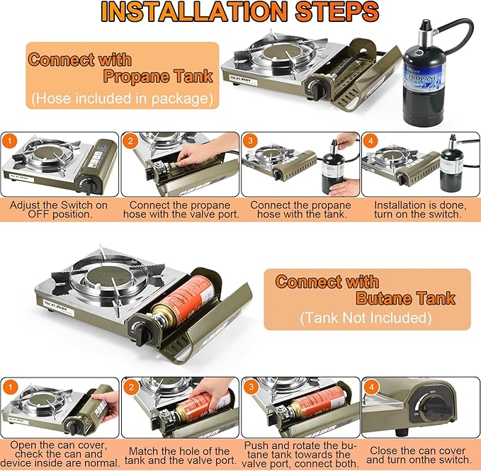 • 🔥Dual Fuel Camping Stove:MOZODAWN dual gas fuel stove is compatible with both butane and propane fuel canisters, and you can easily connect a propane tank to the camp stove using our propane hose.Can meet your different fuel needs.