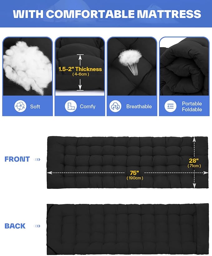 • Use Anywhere: You can bring the foldable outdoor camping cots for adults with mattress anywhere you take adventures, from indoor use to camping, the beach, the office or for visiting guests at home. Give yourself better sleep!