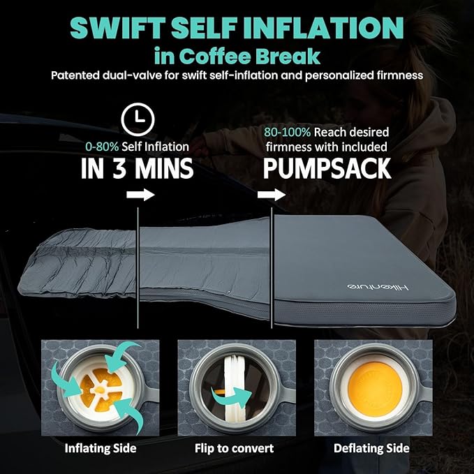 • 𝗧𝗜𝗖𝗞𝗘𝗧 𝗧𝗢 𝗜𝗡𝗦𝗧𝗔𝗡𝗧 𝗥𝗘𝗟𝗔𝗫𝗔𝗧𝗜𝗢𝗡 - Enjoy the ease of our camp mattress with innovative double-sided valve, designed for effortless self-inflation and deflation, preventing any backflow. Just a simple flip and our self inflating camping pad springs to life in minutes. The dual-purpose carry bag serves also as pump sack which enables you to adjust the car sleeping pad's firmness to your personal taste.