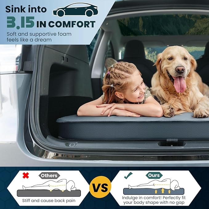 • 𝗘𝗟𝗘𝗩𝗔𝗧𝗘 𝗖𝗢𝗠𝗙𝗢𝗥𝗧 𝗢𝗡 𝗧𝗛𝗘 𝗥𝗢𝗔𝗗 - Transform your Model Y into a cozy haven anywhere, anytime! With a unique combination of 3.15 INCH thick foam and air, our camping sleeping pad can effortlessly support up to 440 pounds, and is fully adjustable for personalized softness and support, ensuring a higher level of comfort and a restful night's sleep for all sleeping positions.