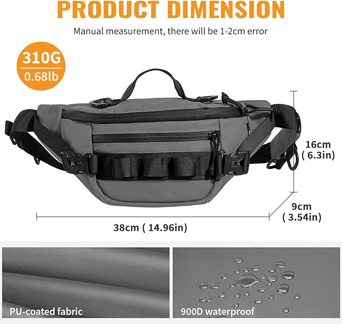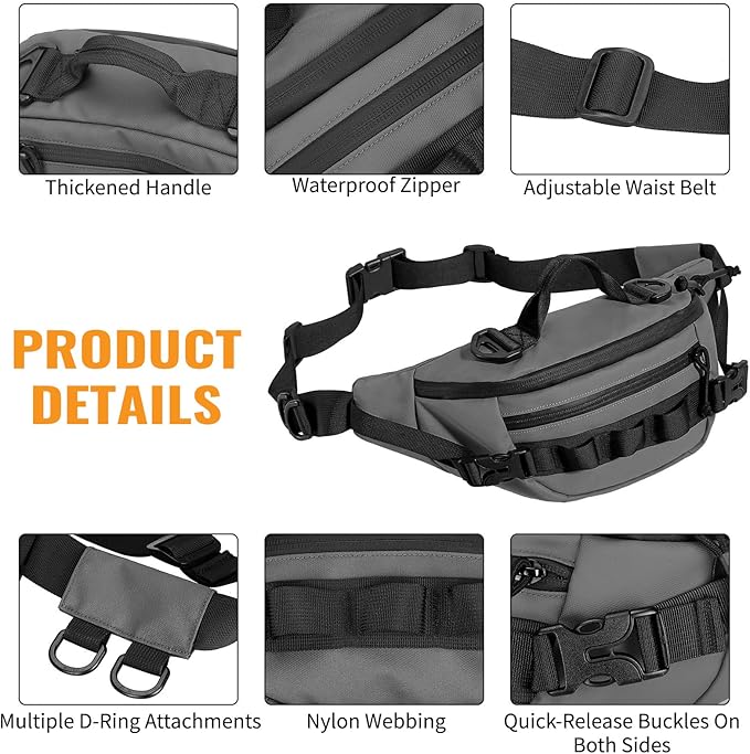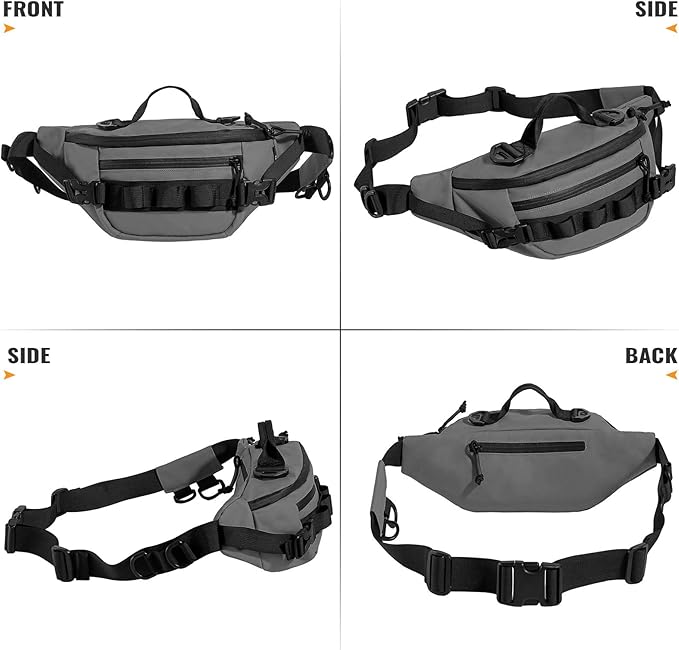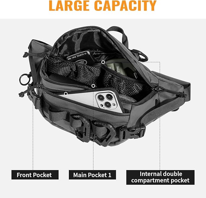 • 🔘 MOLLE DESIGN -- The tactical fanny bag adopts MOLLE external expansion system on the front side, you can load additional pockets, water bottle pocket, fishing accessory kits and other tactical utility/gadget accessories.