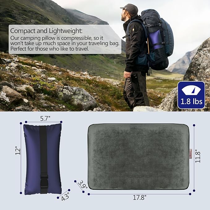 • ✅【Compact and Lightweight】Weighing only 1.8 lb and packing down to 5.7 x 4.3 x 12 inches, this small camping pillow is easy to carry and store, making it perfect for outdoor camping, hiking, and backpacking. camping accessories for tent campers.