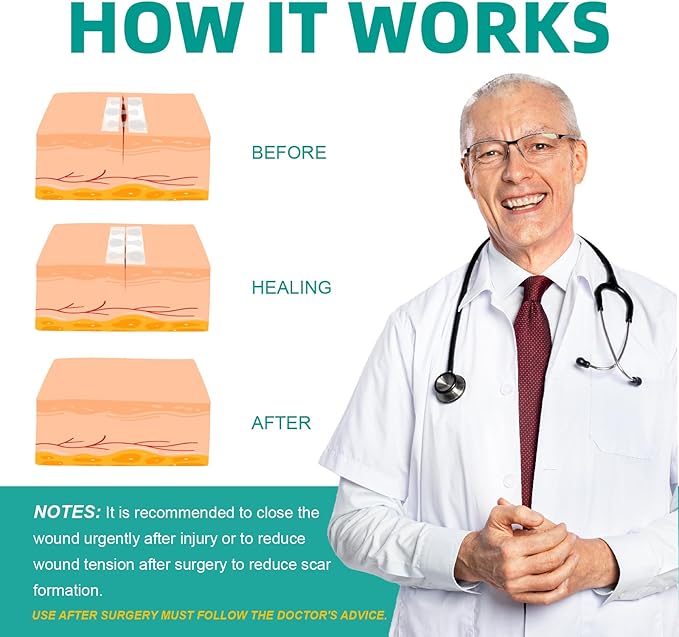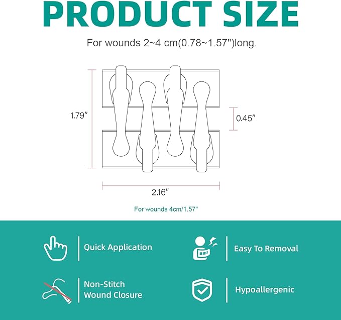 • WOUND CLOSURE STRIPS: It is a non-invasive, painless, alternative to stitches. The laceration closure kit is more convenient than traditional stitches. The device can reduce tension, reduce hyperplasia and beautify wounds, and is ideal for sensitive skin and kids, ensuring a safer and faster recovery.