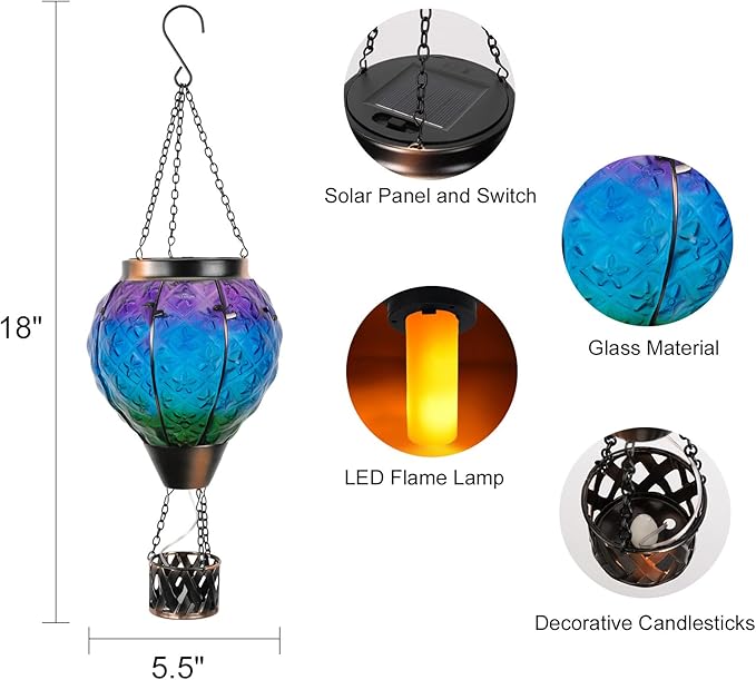 • Perfect Gifts:Whether you are looking for Housewarming, Valentine's Day, Birthday, Father's Day, Easter, Halloween, Thanksgiving, or Christmas gifts, Your family or friends will be delighted to receive hot air balloon solar lanterns. Hot air balloon has rich meanings, which represents courage, hopes, dreams, romantic love. Size:5.8" L x 5.8" W x 18" H.