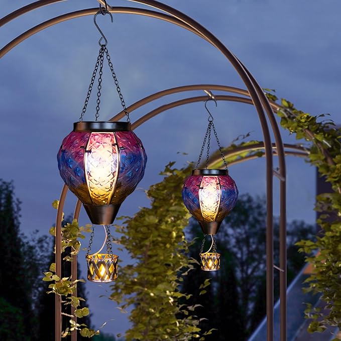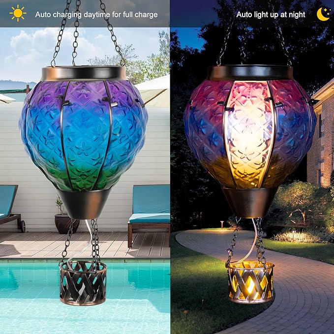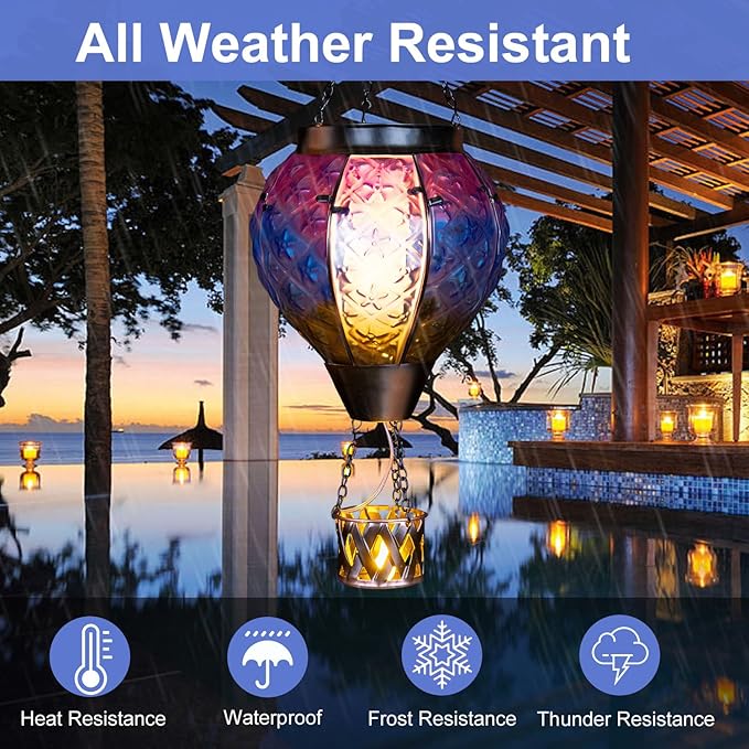 • Hot Air Balloon Solar Lanterns:The solar lanterns outdoor waterproof has a unique design that incorporates the classic elements of a hot air balloon. Its shape resembles a hot air balloon floating in the air, with a candlestick hanging below. Coupled with the flickering flame design and rainbow-like colorful gradient colors, the outdoor lantern is full of dreamy atmosphere, creating a warm and romantic atmosphere for your garden.