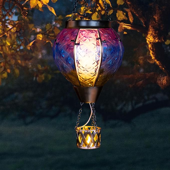 Hot Air Balloon Solar Lantern with Candle Holder,Glass Hanging Solar Lantern with Flickering Flame,Solar Lanterns Outdoor Waterproof for Lawn Patio Porch Tree Decor