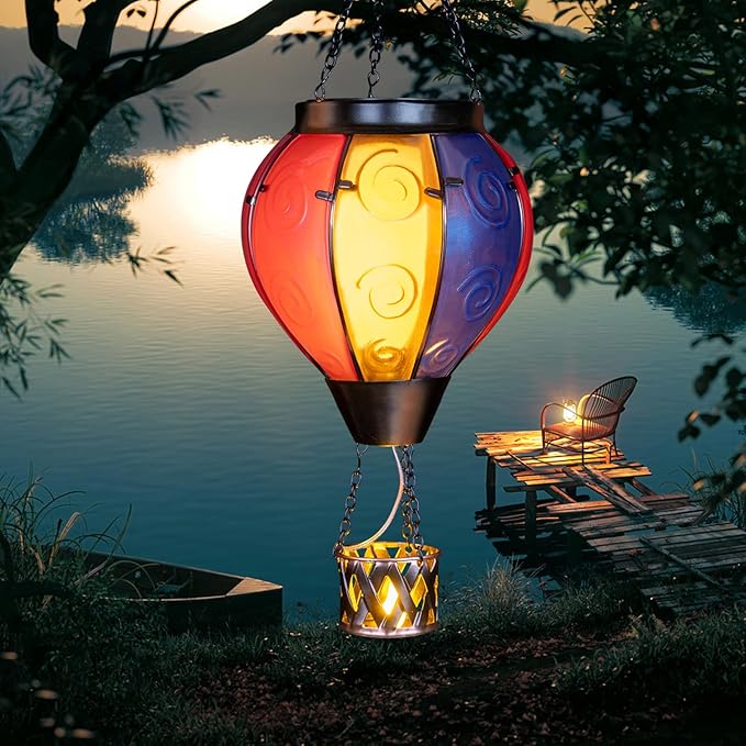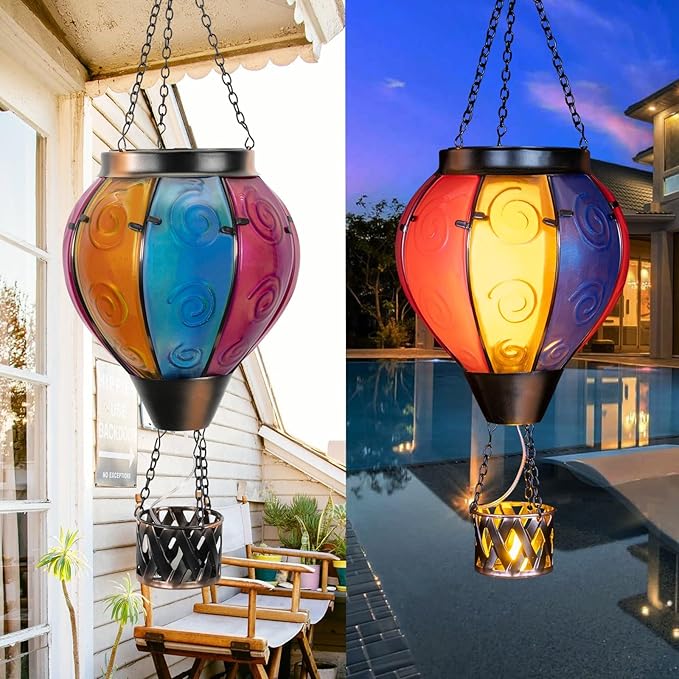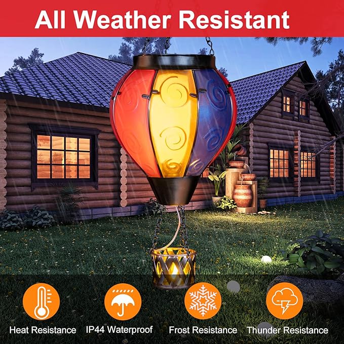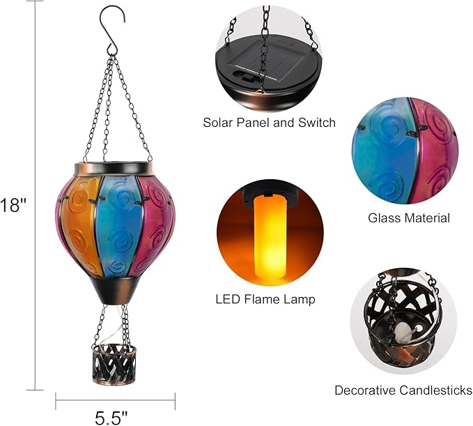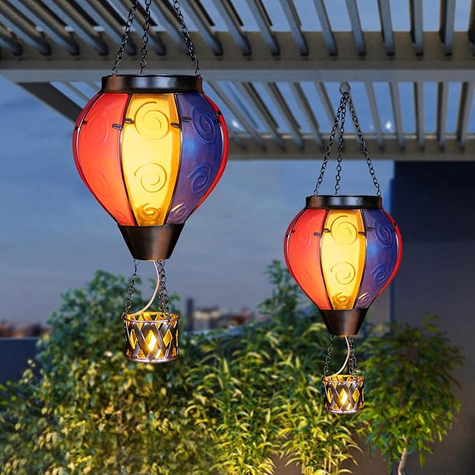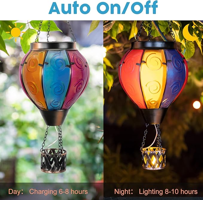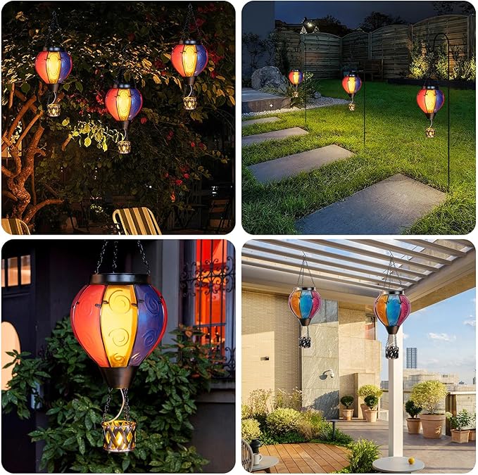 • Hot Air Balloon Solar Lantern:Our hanging solar lanterns have been updated with bright colors, unique hot air balloon shapes and small candles in the basket. When the hot air balloon solar lantern is lit, the flashing flame lamp and the candlelight in the basket make it more like a hot air balloon that is rising, creating a stunning visual effect, and also placing our good wishes to give people warmth.
