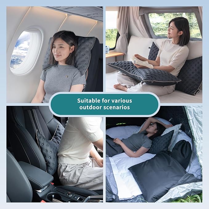 • Back Straps: The back of camping pillow is equipped with three 3-position adjustable straps, the horizontal strap is suitable for a variety of camping mats and can be hung on luggage poles. Vertical straps can be firmly fixed on the headrest of car seats