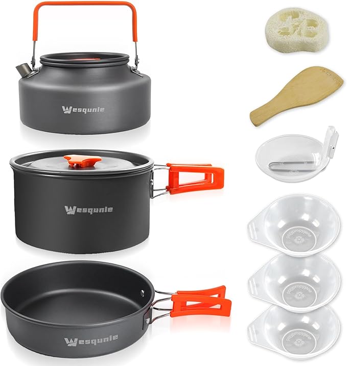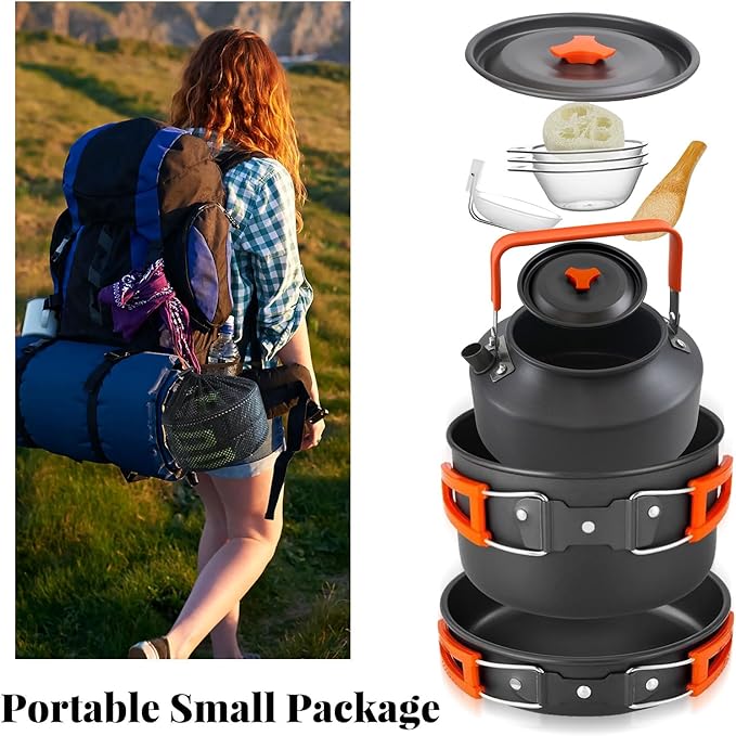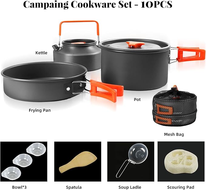 • 10PCS Outdoor Cooking Set - The camping utensils set includes 1 x pot, 1 x frying pan, 1 x kettle, 1x spatula,3x bowls,1x soup ladle, 1 x souring pad,1 x carrying mesh bag. A great choice for hiking, camping,mountaineering, picnic or other outdoor activities