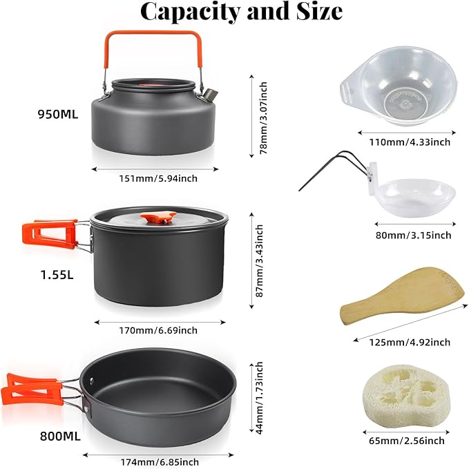 • Camp Cookware Set for 1 to 3 People - The pot is of 1.55L capacity, the fry pan is of 6.85'' diameter and the kettle is 0.95L. This camping pot and pan set will be great not only for boiling water but meal prep too and it is suitable for 1-3 people
