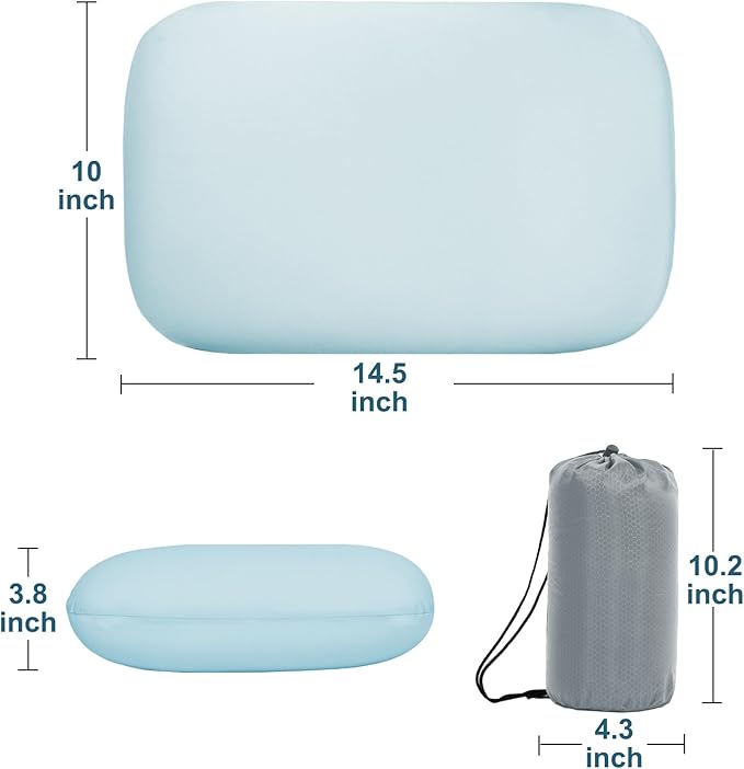 • Lightweight & Easy to Carry. Camp Pillow Size: 14.5 x 10.0 x 3.8 inches. Packed Size: 10.2 x 4.3 x 4.3 inches. Camping pillow for sleeping can be fold easily into a small travel bag with adjustable buckle and drawstring design. Travel pillow is small and light which is easy to carry when you go outside.