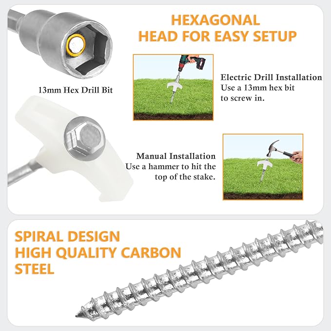 • 🧰𝐅𝐥𝐞𝐱𝐢𝐛𝐥𝐞 𝐈𝐧𝐬𝐭𝐚𝐥𝐥𝐚𝐭𝐢𝐨𝐧 - Considering the convenience of using screw tent pegs, we provide right tool accessories for installation. Equipped with 1 power-driven 13mm drill bit, you can use a drill tool to easily drive the stakes into the ground. Or use a hammer tool for installation. The spiral structure of the metal threaded tent spike provides a stronger grip.