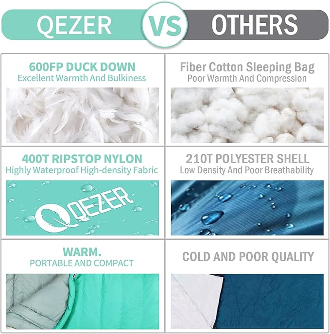 • 【 𝐒𝐀𝐓𝐈𝐒𝐅𝐀𝐂𝐓𝐈𝐎𝐍 𝐆𝐔𝐀𝐑𝐀𝐍𝐓𝐄𝐄 】QEZER always provides our customers with the best sleeping bag products and services with stylish design, premium down and more perfect outdoor functions. If you have any product questions, please contact us via Amazon and provide your order number, we will respond sincerely and do our best to keep you satisfied.