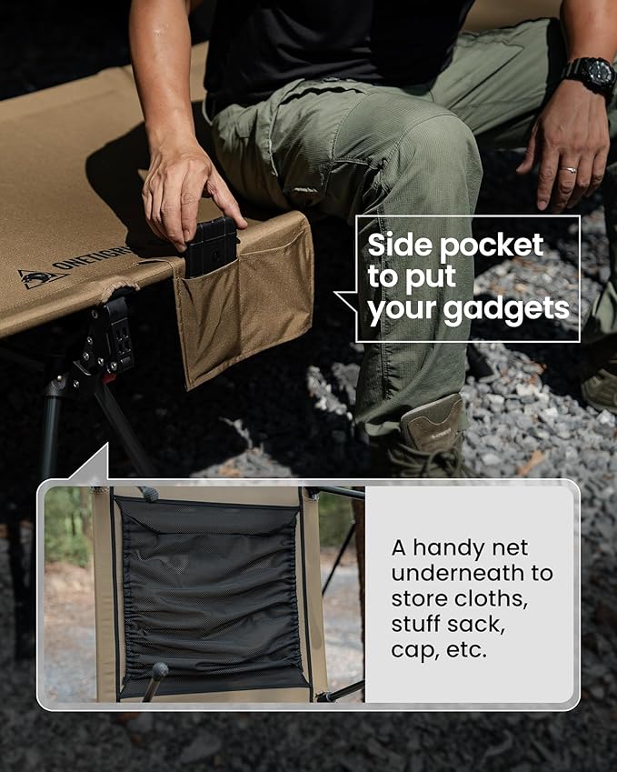 • โ˜… ๐™Ž๐™ฅ๐™š๐™˜๐™ž๐™–๐™ก ๐˜ฟ๐™š๐™จ๐™ž๐™œ๐™ฃ โ€“ A side pocket to put your gadgets for easy access, phone, power bank, snacks, camera equipment, emergency kit, etc. And a storage net underneath the camp bed for your clothes, hats or laundry, which is very handy
