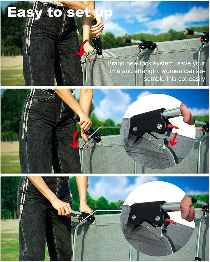 • VERY QUICK and EASY SETUP, save your precious time and strength. With the brand-new locking system of the legs, people without much strength can assemble this cot easily. Instructions included.