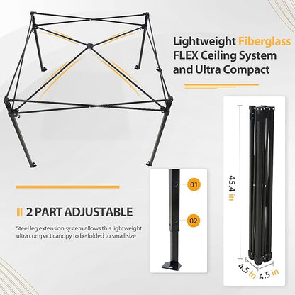 • WHAT’S INCLUDED: 4x4 Pop-up Canopy Frame, 140g polyester top fabric, 140g polyester canopy sidewalls with easy-entrance zipper for complete enclosure, 2 mesh storage pockets sewn into the sidewall, 1 ceiling hook can hold up to 50 lbs, 1 carry bag.