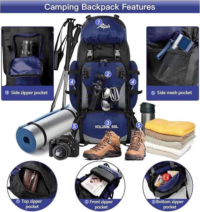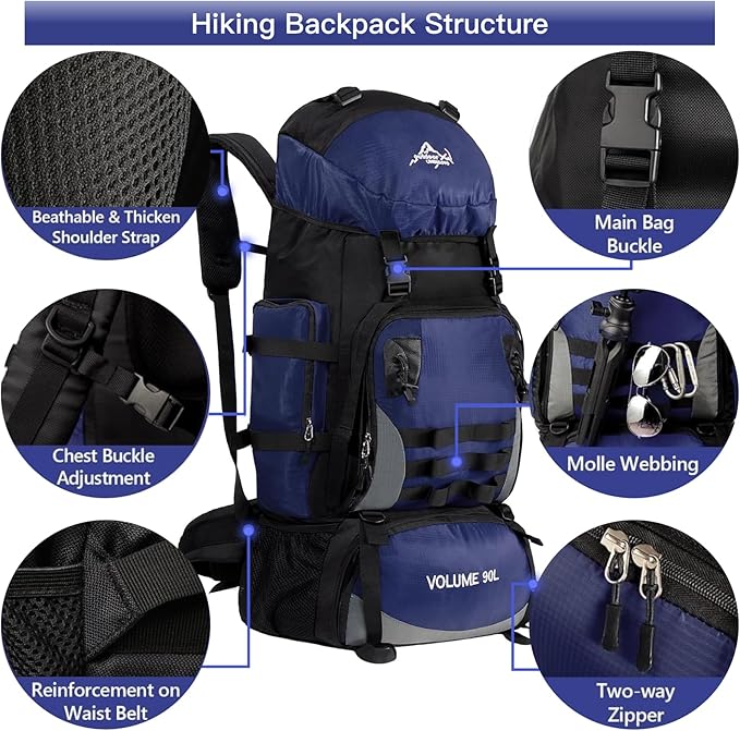 • 【Hiking Backpack Structure】: The 90L camping backpack main compartment is drawstring closed, hiking backpack roomy enough for your storage hiking gear, clothes and luggage, one bottom zipper pocket can store shoes separately from the clothes in the main pocket. Two side mesh pocketes are suitable for placing cups and umbrellas. This mountaineering backpack has one front zipper pocket and two side pocketes for separate and orderly storage.