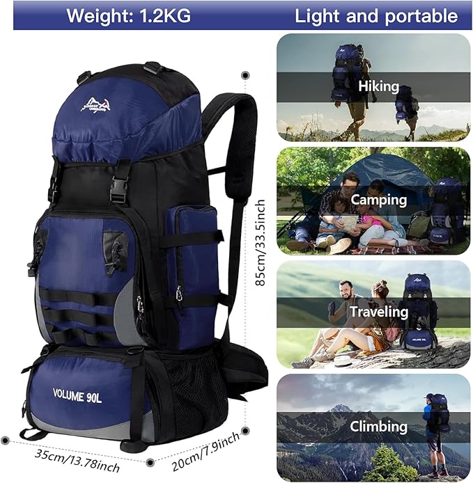 • 【Large Capacity Rucksack】: The 90L Large Capacity Hiking Backpack only 2.65 pounds for easy carrying, adding no burden to your travel. The maximun loading bearing is 45lb. Unfold size: 20*35*85cm/7.9*13.78*33.5in(L*W*H). Perfect size for camping backpack, hiking backpack, trekking backpack, traveling, hunting, fishing.