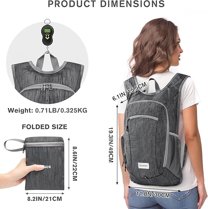 • FOLDABLE: This backpack is easy to fold up into its pocket (Not included an extra pouch. Just its own inner pocket to pack with. ) Unfold size: 19.3x11.8x6.1 inches. Folded size only 8.2 x 8.6 inches, easily pack it in your suitcase, backpack, or car and simply unfold from your checked bags and use it as a carry-on for your excess baggage to avoid the overweight charge.