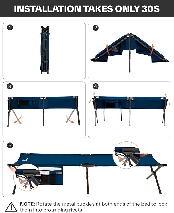 • 30s Instant Installation: With easy-to-use design, you can set up the camping cot for adults in seconds without any risk of injury, even a novice. And don't worry about stability - our cots for sleeping features a leg rotation lock that provides extra support and security. It's so easy to use that even kids can set it up without any trouble. Plus, the bonus 3-in-1 storage bag perfectly keeps all your camping essentials organized and within reach--- phone, keys, water bottle, or glasses and more.