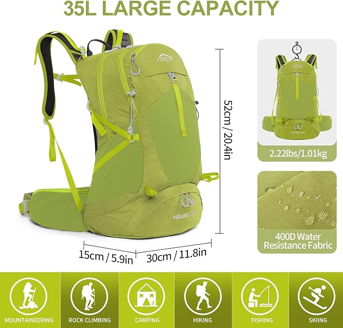 Hiking Backpack,35L Waterproof Hiking Daypack with 3L Water Bladder and Rain Cover, Lightweight Travel Camping Backpack for Men Women (Fruit green)