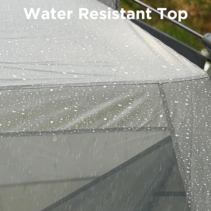 • BUILT FOR STABILITY: With sturdy iron poles and fiberglass support for the top, this screen house room is designed for durability and strength. It also comes with wind ropes and ground stakes to ensure stability even in windy conditions. The 150D Oxford fabric, combined with double-stitching, guarantees tear resistance and long-lasting performance.