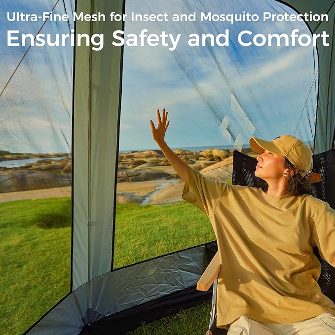 • SPACIOUS DESIGN FOR COMFORT: This Screen tent features a unique hexagonal design, offering ample space for movement and comfort. It's perfect for family outings, group gatherings, and various outdoor activities, providing a roomy environment for all your needs.