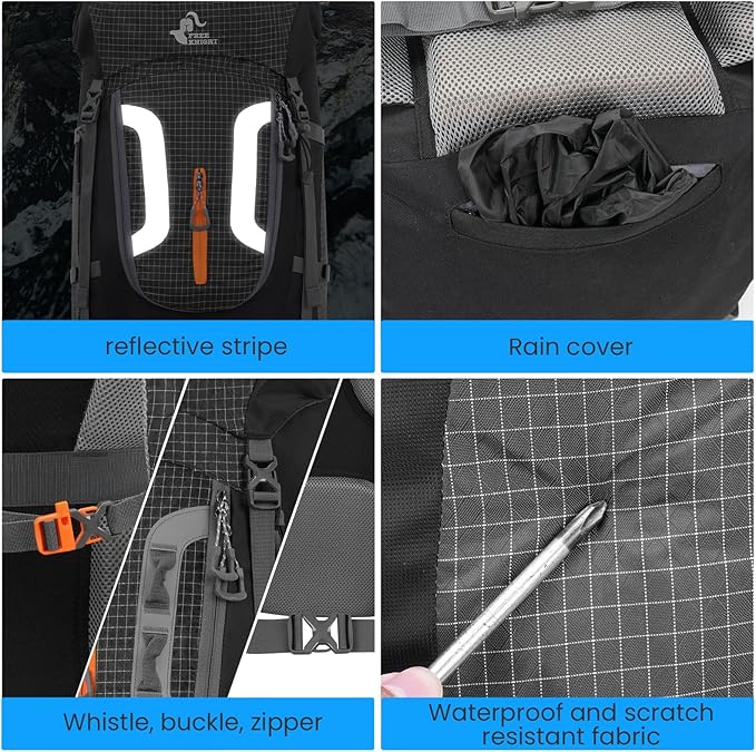 • Water-resistant: Made of high-quality and safe material, it is durable for long-time use. The nylon fabric material made of High-quality ripstop polyester material, is water-resistant and tear-resistant. There is also an extra rain cover included in the bottom pouch to prevent the water and dust from getting into the backpack, protecting your valuables from heavy rain and keeping everything dry.