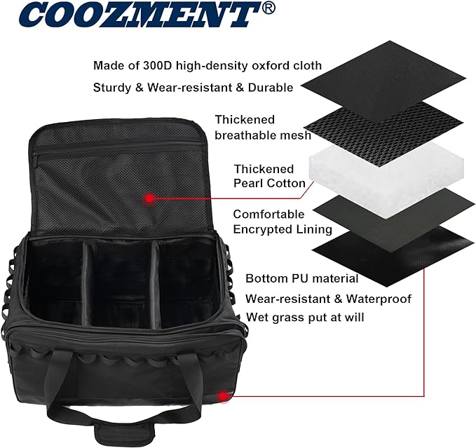 • 👍HIGH QUALITY STORAGE BAG - This Camping Duffle Bag is made of 300D Oxford cloth and clip mesh, waterproof and wear-resistant. The bottom material is PU waterproof material, which can be placed on the wet ground.Inside with 3 adjustable compartments, you can flexibly adjust 1-4 spaces. Both sides are reinforced with plastic and the best metal zippers to make it as durable as possible.