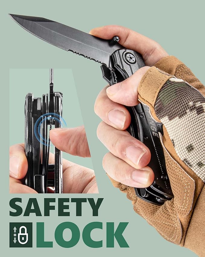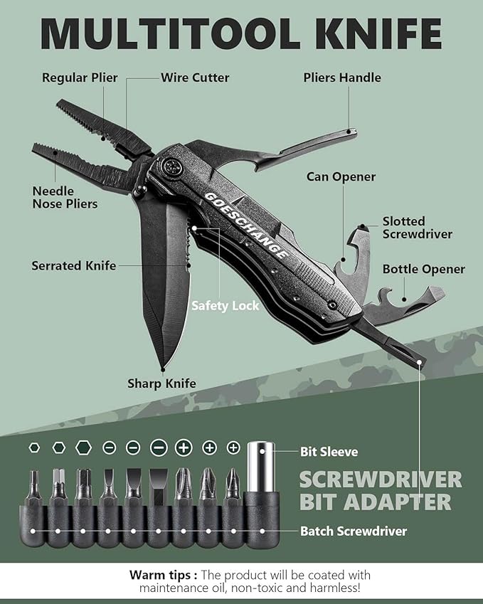 • 10-in-1 Multitool Set: Meet all your needs with this versatile tool set, featuring Needlenose Pliers, Regular Pliers, Wire Cutter, Serrated Knife, Can Opener, Slotted Screwdriver, Can Opener, Sharp Knife and multi kinds of Screwdrivers.