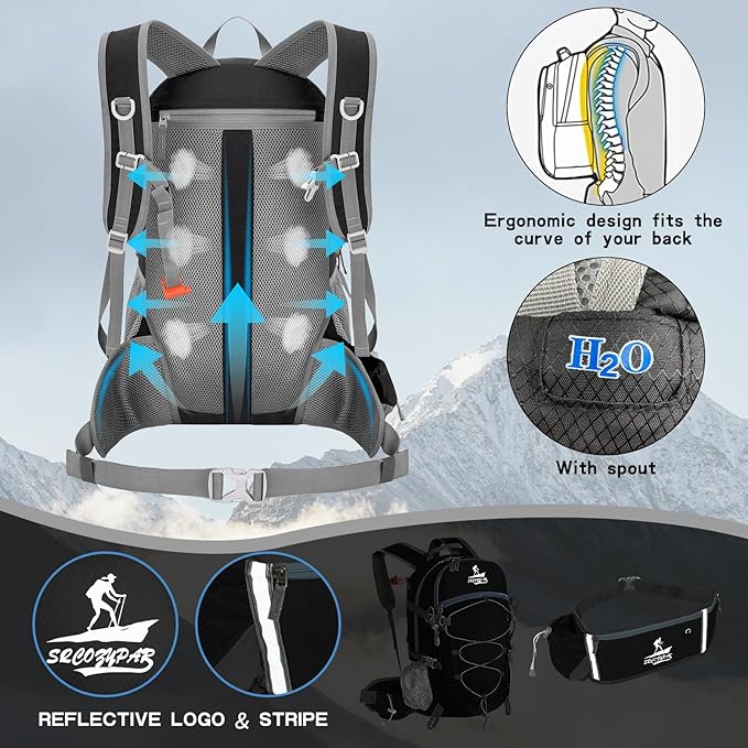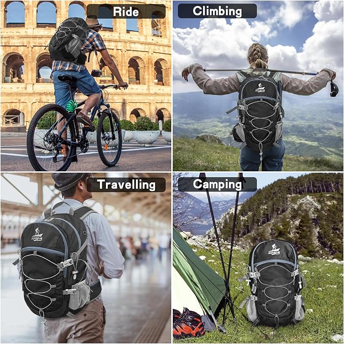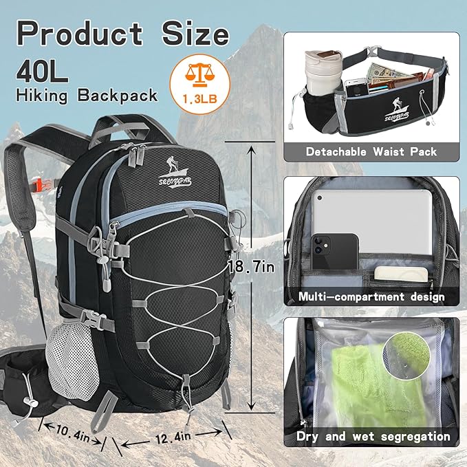 • LIGHTWEIGHT TRAVEL BACKPACK: This portable hiking backpack has a large storage capacity of 40 liters, collapsible travel backpack is designed with a multi-compartment backpack, a main zippered compartment, a zippered front pocket, a rear wet pocket, and two side pockets, as well as a removable hidden waist pack, large enough space to help you organize more hiking gear, and the rear wet pocket backpack can effectively protect your electronics from moisture, or separate wet clothes from them
