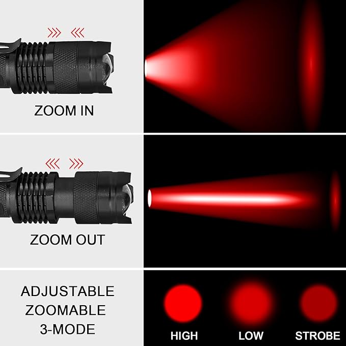 • 3 MODES NIGHT VISION: 3 light modes (high/low/strobe) can be changed by switch button, strobe mode of the red flashlight can send signal and protect your safe for emergency; with high mode you can have the powerful red light; with low mode you can have energy saved.