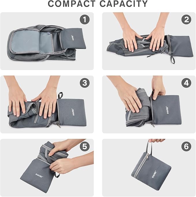 • FOLDABLE: This backpack is easy to fold up into its pocket (Not included extra pouch. Just its own inner pocket to pack with. ) Unfold size: 15.5x9x3.5inches. Folded size only 7.5 x 6inches, easily pack it in your suitcase, backpack, or car and simply unfold from your checked bags and use it as a carry-on for your excess baggage to avoid the overweight charge.