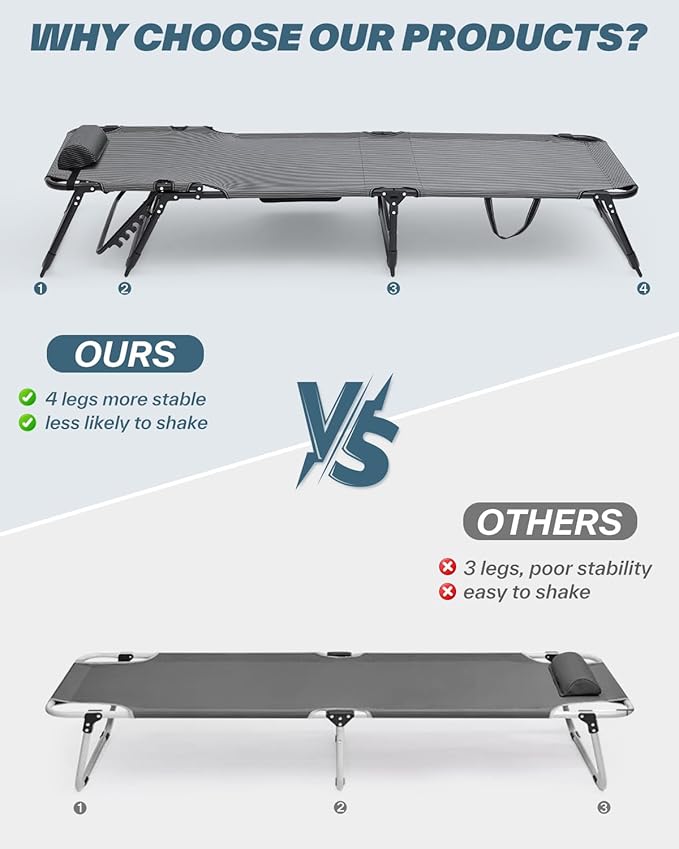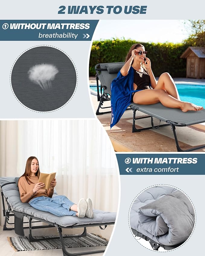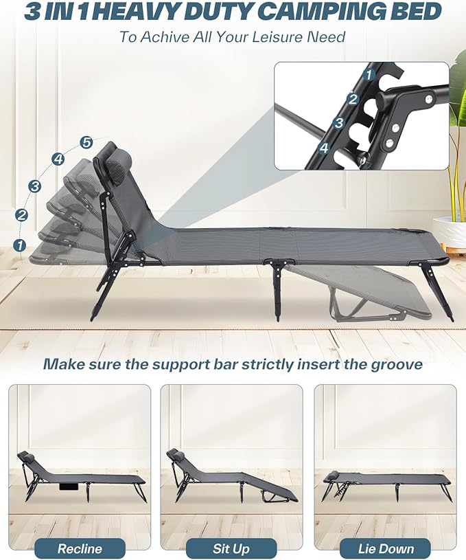 • 5-POSITION ADJUSATBLE LOUNGE CHAIR COT: Sportneer's adjustable chaise lounge integrates versatile functions of reclining, sleeping, and sitting positions into one! You can adjust it to find your ideal angle for optimal comfort and relaxation. Whether you prefer a cozy chair or a plush bed, this cot effortlessly adapts to meet your diverse needs!