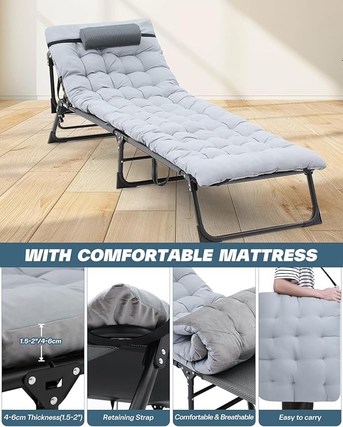 • PORTABLE AND VERSATILE: This folding chair cot bed free assembly, it can be unfolded for use, and can be folded up in 10 seconds. The folding design is easy to store and carry. Ideal for camping, patio relaxation, poolside lounging, balcony leisure, beach outings, travel, office naps, sunbathing, road trip, or as a convenient guest bed when guests visit your home. Enjoy the convenience and versatility it brings to your lifestyle with our cot!