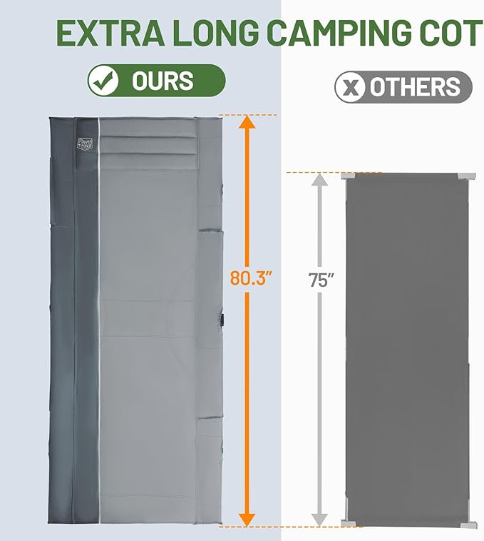 • Extra Wide Folding Cot: Featured with 31.8in width, the cot for sleeping is much wider than usual and optimal for all. You can feel free to turn over on the cot. 17.3in off the ground keeps you from the moisture.