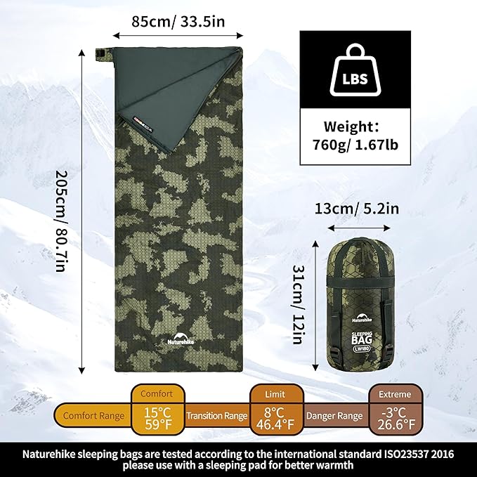 • 【ULTRA LIGHTWEIGHT AND COMPACT】Naturehike Ultralight Compact Sleeping Bag weighs only 2lbs and the compressed storage volume is only ф13x31 cm / 5*12 inches. The lightweight and compact design makes it easy to carry this sleeping bag anywhere you go. The sleeping bag can also be packed in the included carrying bag with compact straps