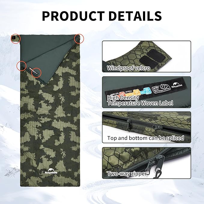 • 【ULTRA LIGHTWEIGHT AND COMPACT】Naturehike Ultralight Compact Sleeping Bag weighs only 2lbs and the compressed storage volume is only ф13x31 cm / 5*12 inches. The lightweight and compact design makes it easy to carry this sleeping bag anywhere you go. The sleeping bag can also be packed in the included carrying bag with compact straps