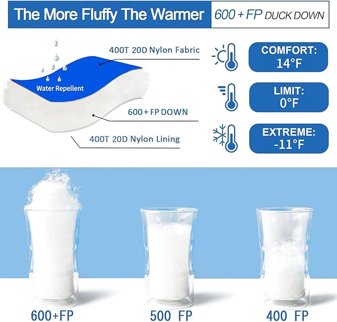 • Keep Warm: Backpacking sleeping bag Filled with 3.3lbs 600 FP premium duck down, comfort temperature 0°F-18°F, limit -11°F. Double zipper design prevents cold air, added chest insulation for better warmth